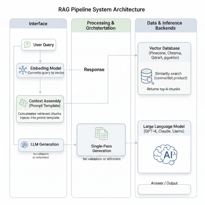 Traditional RAG implements a deterministic, feed-forward architecture where each stage passes results to the next without feedback or adaptation. Understanding this pipeline is essential for recognizing where it thrives and where it fails in enterprise contexts.