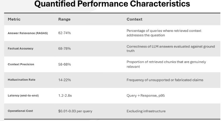 Production deployments of Traditional RAG demonstrate consistent performance profiles across domains: