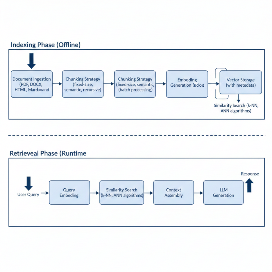 4. Vector Storage: Embeddings and metadata (document ID, chunk index, timestamp, source URL) are persisted in a vector database with appropriate indexing for fast ANN queries.