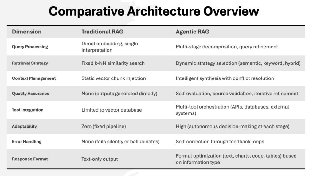 The distinction between Traditional RAG and Agentic RAG is not academic. It reflects a fundamental recognition that enterprise AI systems must evolve from passive information retrievers to proactive, reasoning-driven knowledge workers capable of handling ambiguity, complexity, and consequence.