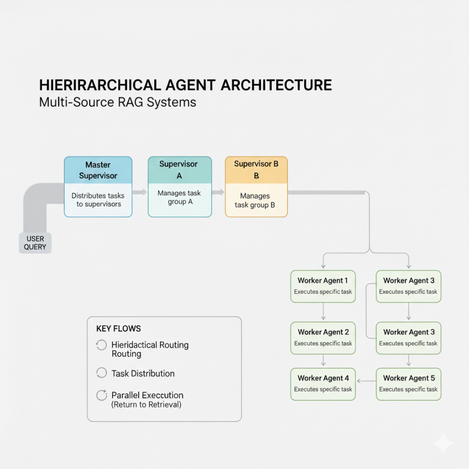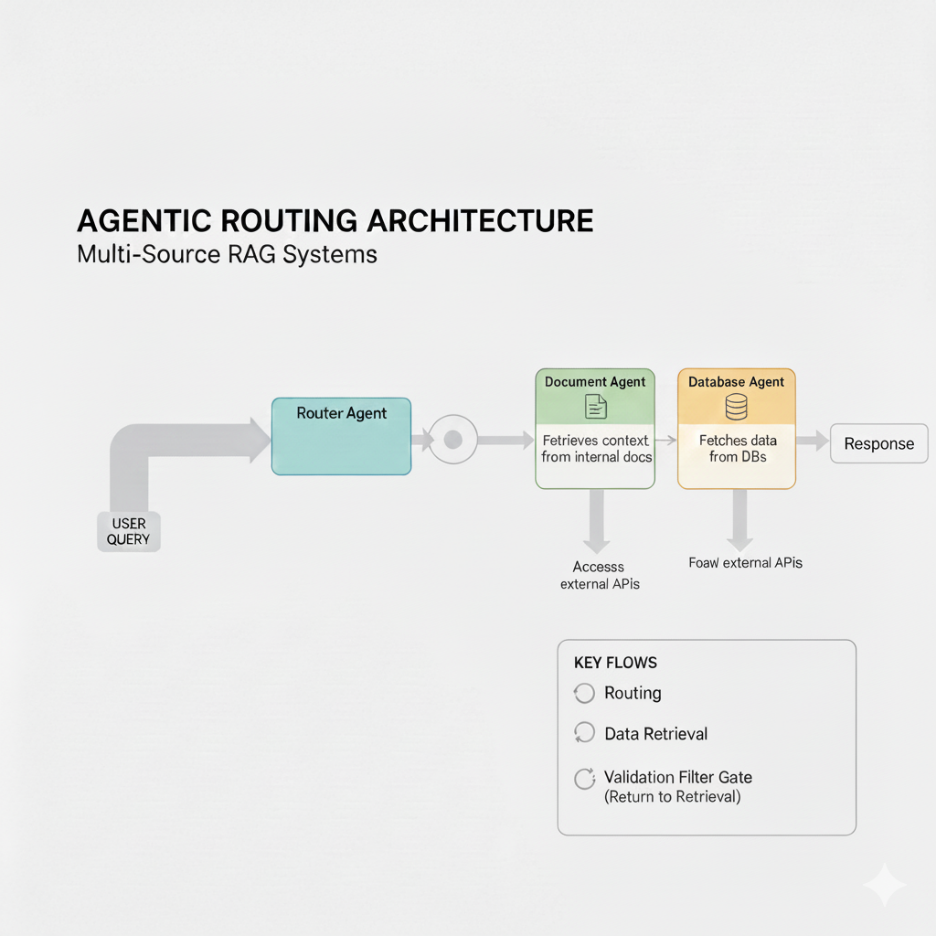 Most Traditional RAG implementations query one vector database. Enterprise environments have multiple knowledge silos: CRM systems, ERP documentation, wiki pages, customer support tickets, compliance databases, and structured data warehouses. A query requiring insight from multiple sources—e.g., "Why did customer X churn, and which product features could have prevented it?"—cannot be answered by retrieving from a single knowledge base.