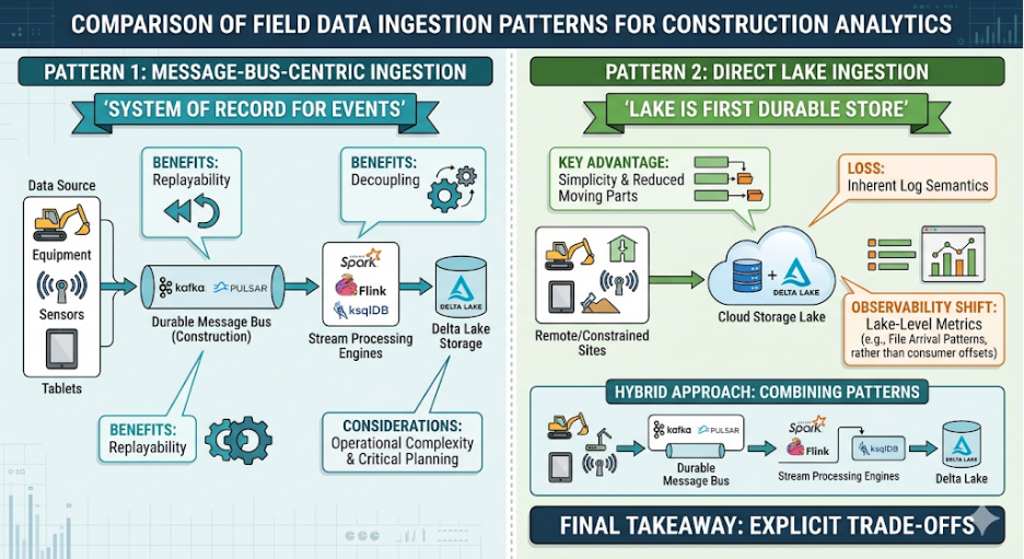 There are two common architectural categories for getting field data into the analytics platform: message‑bus‑centric and direct lake ingestion.