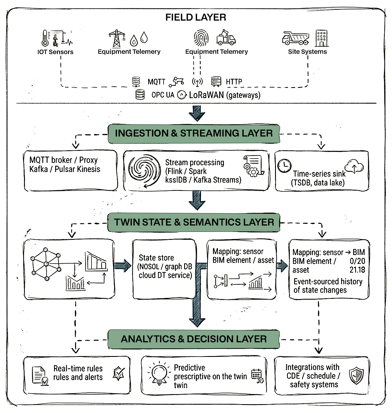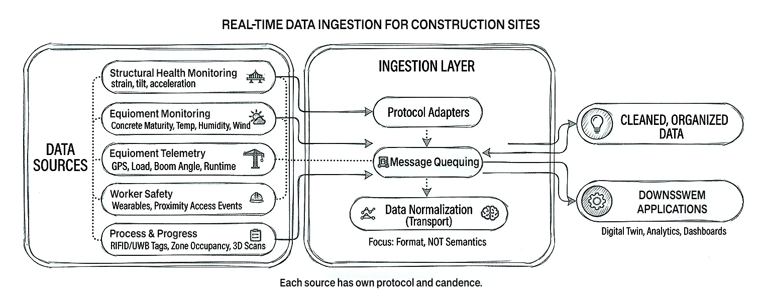 The ingestion layer's job is not to understand BIM—it's to reliably land clean, timestamped, schema-validated events into the streaming platform or lakehouse.