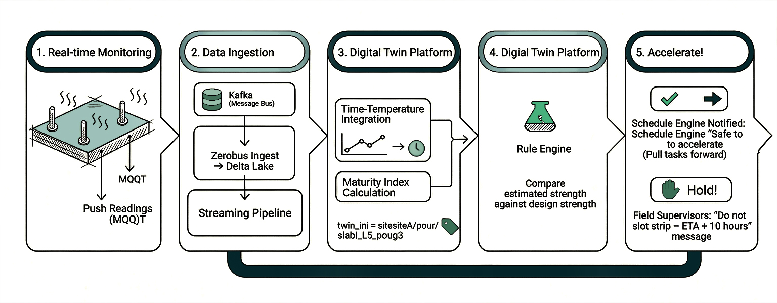 1. Temperature sensors embedded in slabs and columns push readings every few minutes via MQTT → Kafka (or Zerobus Ingest → Delta).