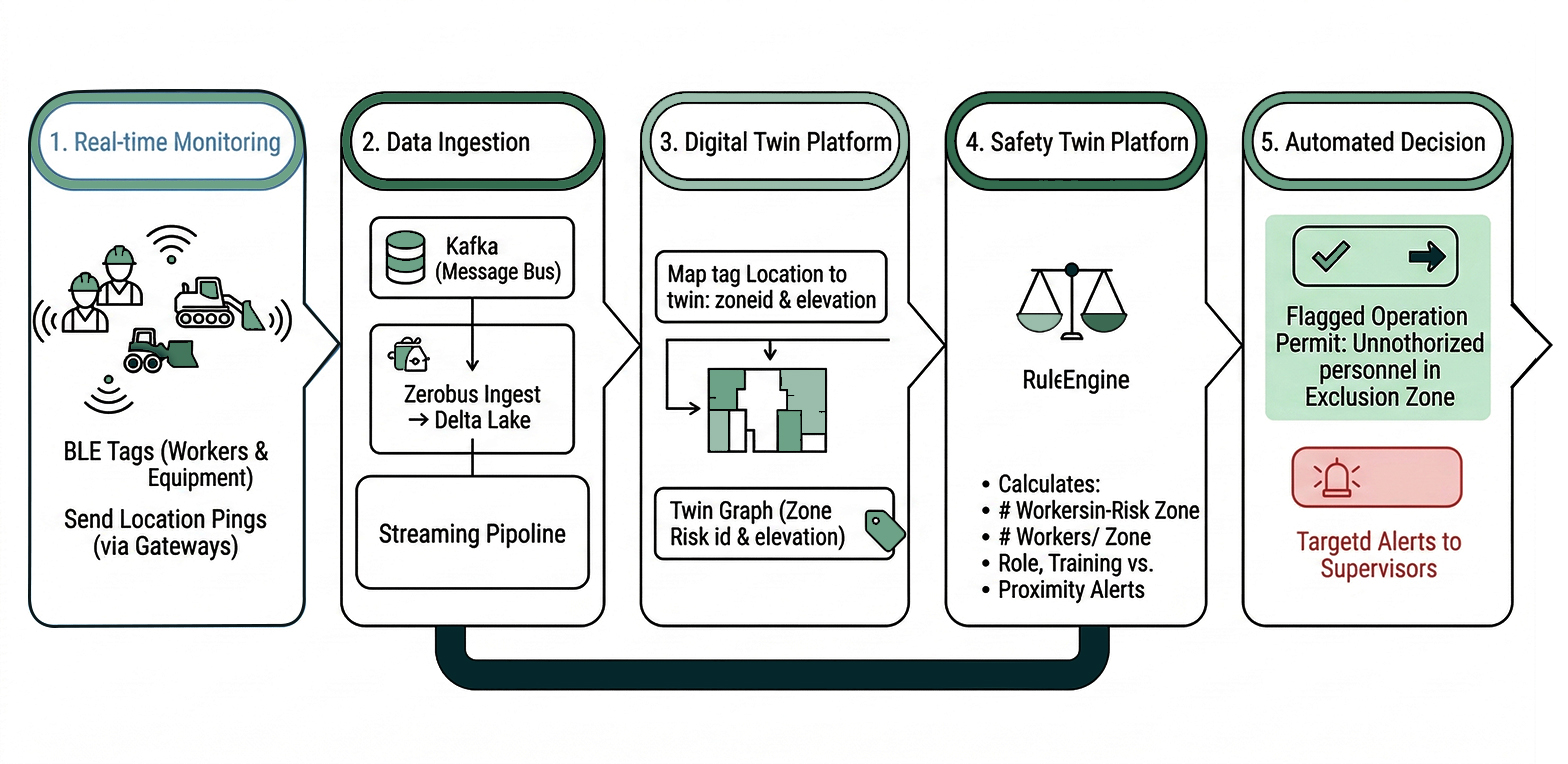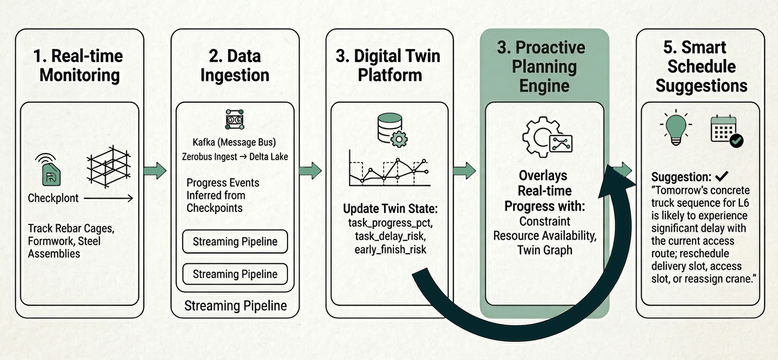 The pipeline is built — now does it change anything on site? This post moves from architecture to outcomes. Using the twin pipeline from Part 1, we walk through four real decision loops: formwork release driven by concrete maturity, crane stop-work alerts under combined wind and load, dynamic safety zone enforcement via BLE tracking, and intra-day schedule re-optimization from live progress data. We also cover implementation strategy, stack selection, and closing the loop into planning and safety systems. We close with a forward look at agentic AI on the twin — from decision support to autonomous operational co-pilot.