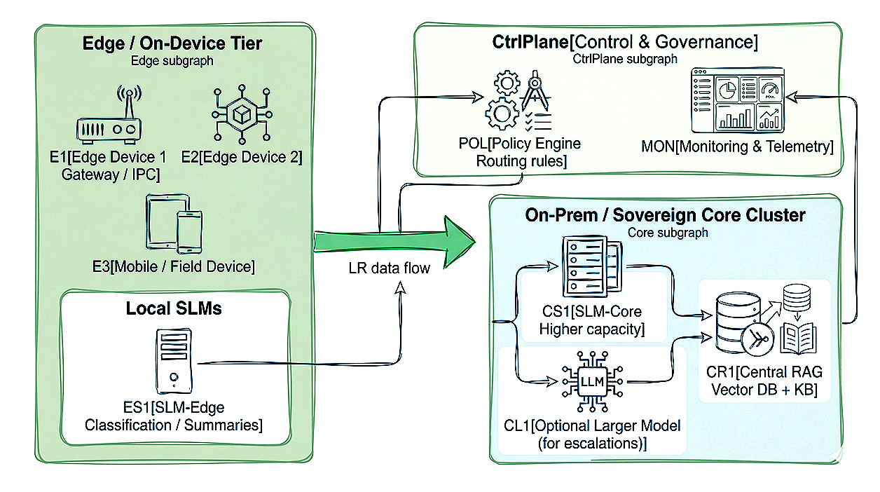 Edge-first architectures place SLMs directly on endpoint or near-edge devices for real-time, low-latency processing, with optional fallback to larger core models.